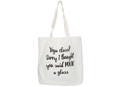 - The bag features the cute phrase, 'Yoga Class? Sorry I Thought You Said Pour A Glass' printed on the front in quirky, loopy black font