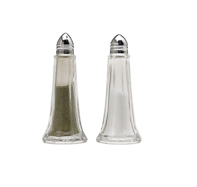 Traditional shape salt and pepper shakers with glass bases and chrome tops.