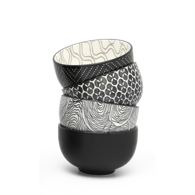 Set of 4 tea bowls with attractive patterns. Matches the Pucheng teapot. The bowls are dishwasher safe.