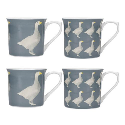 Made from china and with a 425ml capacity, each barrel-shaped mug features a collection of geese on a blue grey background and has an ample handle for a comfortable grip.