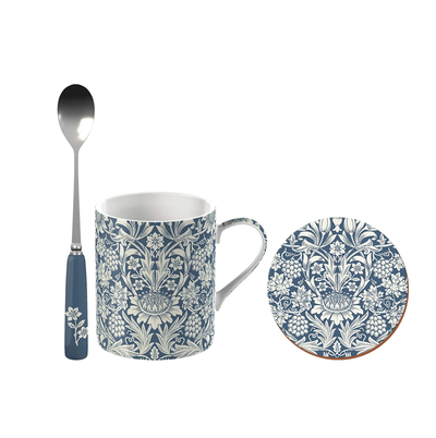 V&A William Morris Sunflower Printed Fine China Mug Set with Coaster and Teaspoon, Blue & White, 3 Pieces