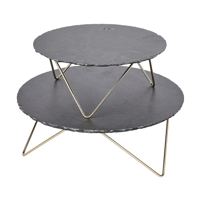 - The two-tier serving stand made of natural slate has round serving platters and modern metal legs