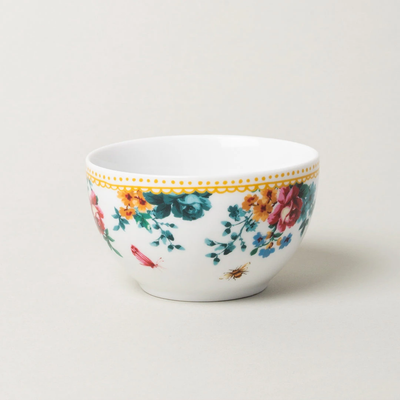 A dip bowl, a sugar bowl or a trinket bowl, our cute Bohemian Spirit small bowl has you covered for a multitude of different uses! The super white porcelain mini bowl is decorated with pretty florals from this vintage-inspired collection. Hot pink roses are nestled between yellow and blue daisies, with a trim of mustard coloured lace to finish around the rim.
