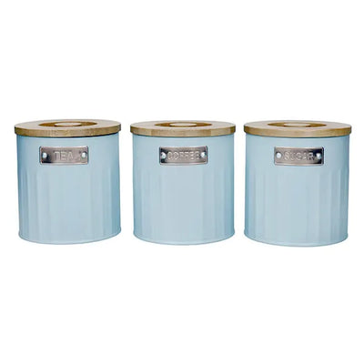 A charming trio of powder‑coated light-blue canisters crafted from rust-resistant galvanized steel with an embossed ribbed finish, each topped with an airtight bamboo lid. Individually labeled for “Tea,” “Coffee,” and “Sugar,” these stylish canisters keep contents fresh while adding a serene splash of color to your kitchen countertop.