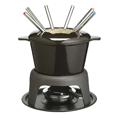 A classic Swiss-style fondue set crafted from heavy-duty cast iron with a stylish black enamel finish. Perfect for cheese, chocolate, or meat fondues, it retains heat exceptionally well to keep your dipping delights warm throughout the meal. Complete with an adjustable burner and six colour-coded forks, it turns any dinner into an interactive and convivial experience.