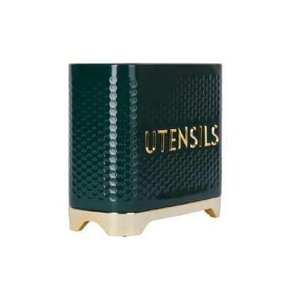Keep your kitchen utensils organised and close to hand with this stylish, retro-modern Lovello Textured Hunter Green Utensil Holder. Featuring an eye-catching geometric texture and elegant curves, this utensil pot is made from durable carbon steel and finished with a luxe Hunter Green powder coating which helps prevent corrosion whilst making it easy to clean with a damp cloth. The word ‘UTENSIL’ is spelled out on the side of the pot, perfectly matching the brass coloured base.