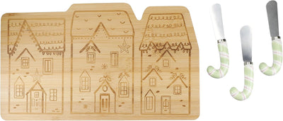 This 4-piece Bamboo Cheese Board Set includes a tempered glass top featuring Nutcracker illustrations and three stainless-steel knives with bamboo handles. A bamboo base slides out to support the board, making assembly and storage effortless.