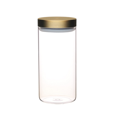 - Food storage doesn't need to be boring. This clear glass jar is topped with a luxurious brass-effect metal lid for a very smart look