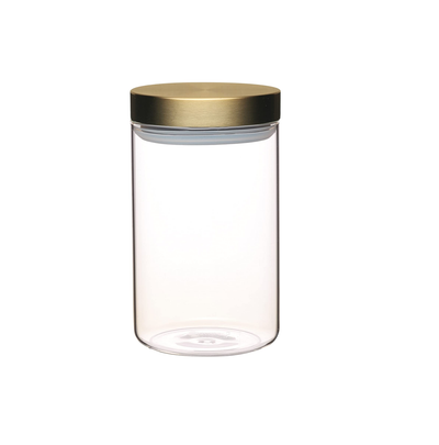 - Food storage doesn't need to be boring. This clear glass jar is topped with a luxurious brass-effect metal lid for a very smart look