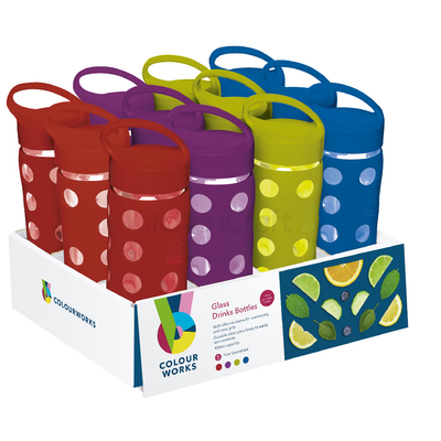 This counter top display of twelve assorted coloured glass drinks bottles with assorted coloured silicone sleeves for cushioning! With leakproof twist off lids and a wide neck for adding ice cubes, these drink bottles are the perfect partner to take along everywhere you go!