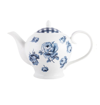 - Crafted in super white porcelain, it features the pretty blue and white rose design with a cute gingham lid and lace details running down the elegantly shaped handle