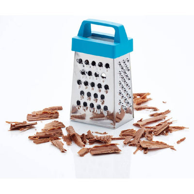 Ideal for grating chocolate, nutmeg, and nuts for use on coffees and desserts, the stainless steel mini grater features coarse, medium, fine, and slice stainless steel blades, and a plastic handle for safe and comfortable use.