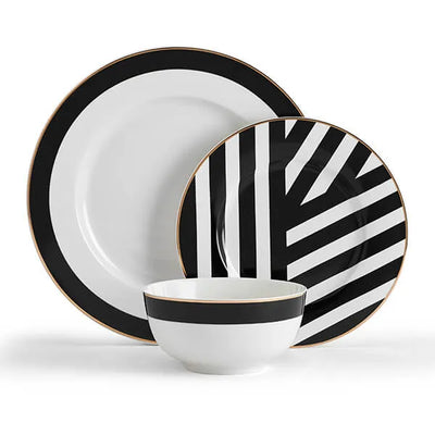 Elevate everyday meals with this 12-piece Luxe Deco dinnerware set, showcasing a striking Art Deco geometric pattern and genuine gold trim. Crafted from fine china, the collection includes service for four—dinner plates, salad plates, and bowls—each piece combining timeless style with dishwasher-safe convenience.